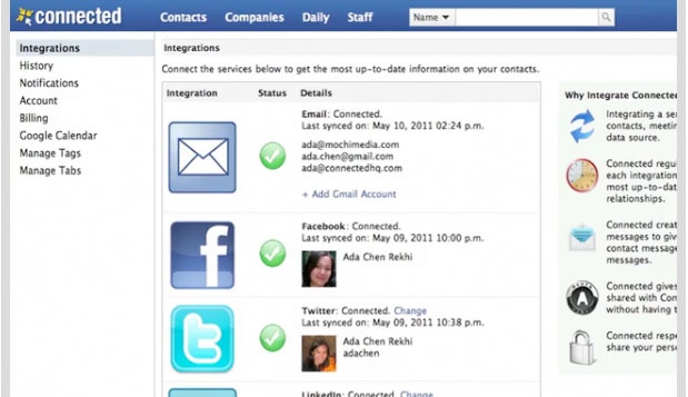 There are plenty of social media dashboards around, but ConnectedHQ ($10 per month) focuses mostly on contacts management. Fortunately, it is all automated: the service pulls in contacts form your e-mail, LinkedIn.com, Twitter, and Facebook. Then, when you click on a contact, you’ll see more than just a name and phone number. You can scan through their work history, see recent postings, and even view recent e-mail exchanges. You can also view job titles, say, only those who are senior directors of another company or who work in your same industry.